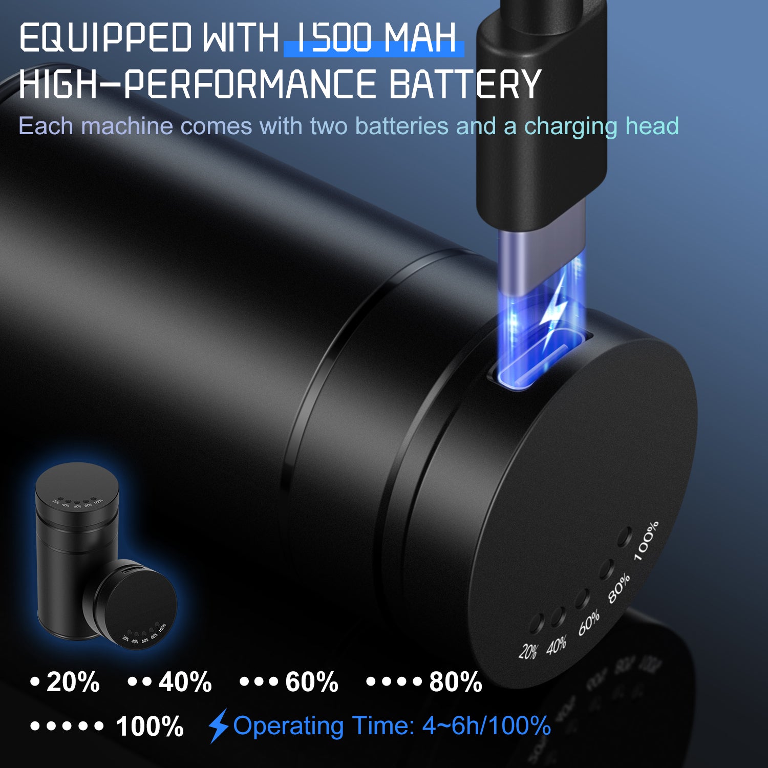 - Long Battery Life: Equipped with a 2000mAh rechargeable battery, the Megrez Tattoo Gun offers up to 8 hours of continuous use on a single charge, allowing for extended sessions without interruptions.
